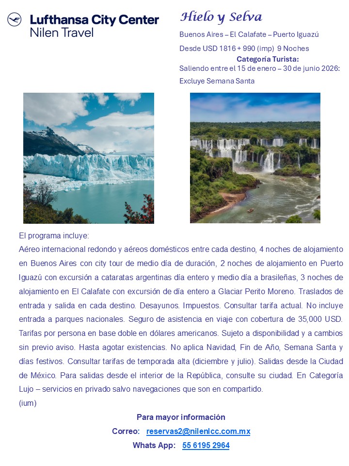 Aéreo internacional redondo y aéreos domésticos entre cada destino. 3 noches de alojamiento en Río de Janeiro con excursión de medio día al Corcovado. 2 noches de alojamiento en Puerto Iguazú con excursión a cataratas argentinas de día entero y brasileñas de medio día. 3 noches de alojamiento en Buenos Aires con HD city tour. Traslados de entrada y salida en cada destino. Desayunos. Impuestos. Consultar tarifa actual. Seguro de asistencia en viaje con cobertura de 35,000 USD. Tarifas por persona en base doble en servicios compartidos. No incluye entradas a parques nacionales. No aplica Navidad/Fin de Año, Revellion, Carnaval, días festivos y Semana Santa. Consultar tarifas de temporada alta (julio y diciembre). Tarifas en dólares americanos. Sujeto a disponibilidad y a cambios sin previo aviso. Salidas desde la Ciudad de México. Para salidas desde el interior de la República, consulte su ciudad. En Categoría Lujo – servicios en privado.